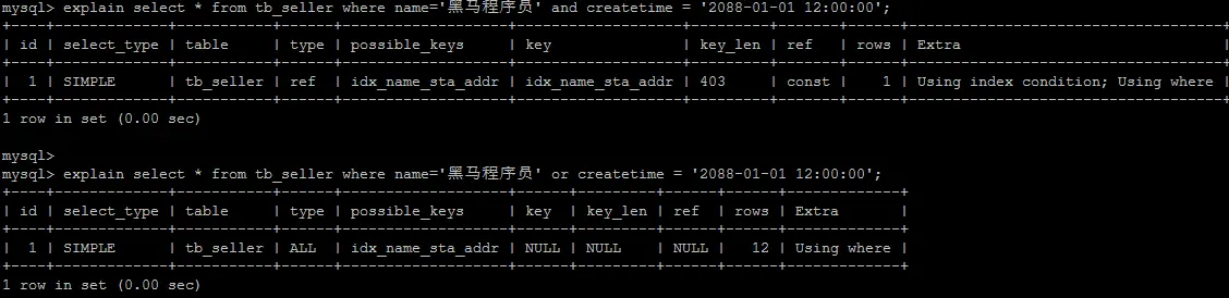 explain select * from tb_seller where name='黑马程序员' or createtime = '2088-01-01 12:00:00'\G;