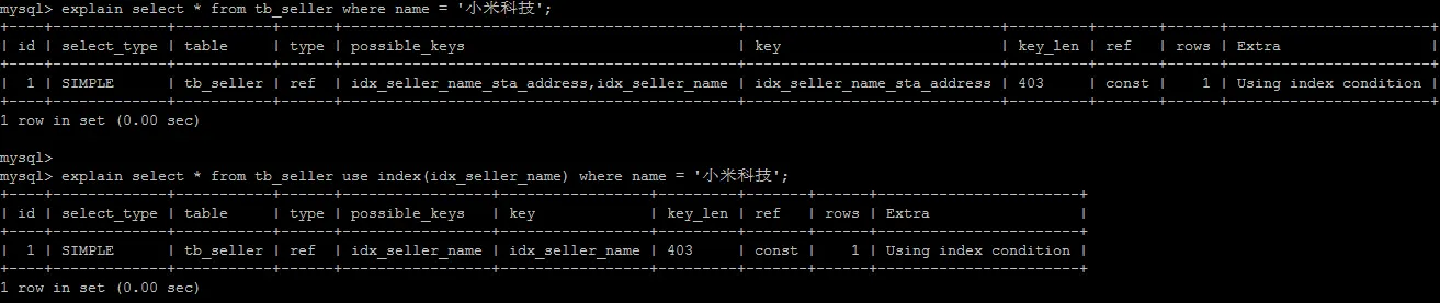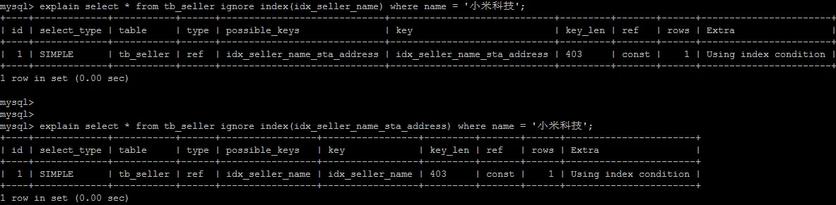 explain select * from tb_seller ignore index(idx_seller_name) where name = '小米科技';