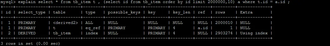一般分页查询时,通过创建覆盖索引能够比较好地提高性能。一个常见又非常头疼的问题就是 limit 2000000,10 ,此时需要MySQL排序前2000010 记录,仅仅返回2000000 - 2000010 的记录,其他记录丢弃,查询排序的代价非常大 。
