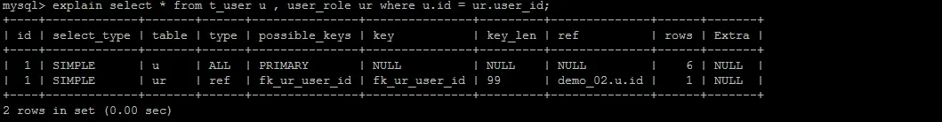 explain select * from t_user u , user_role ur where u.id = ur.user_id;