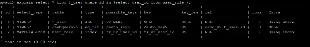 explain select * from t_user where id in (select user_id from user_role );
