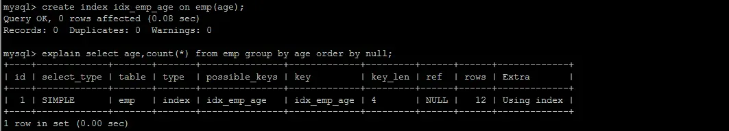 explain select age,count(*) from emp group by age order by null;