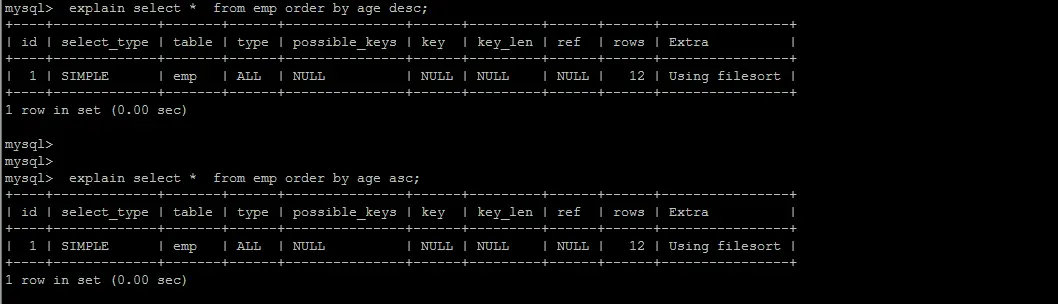 1). 第一种是通过对返回数据进行排序,也就是通常说的 filesort 排序,所有不是通过索引直接返回排序结果的排序都叫 FileSort 排序。