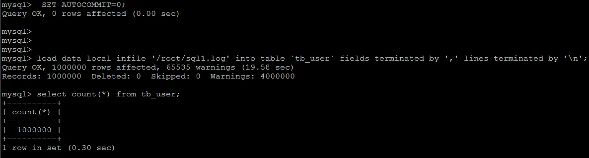 如果应用使用自动提交的方式,建议在导入前执行 SET AUTOCOMMIT=0,关闭自动提交,导入结束后再执行 SET AUTOCOMMIT=1,打开自动提交,也可以提高导入的效率。
