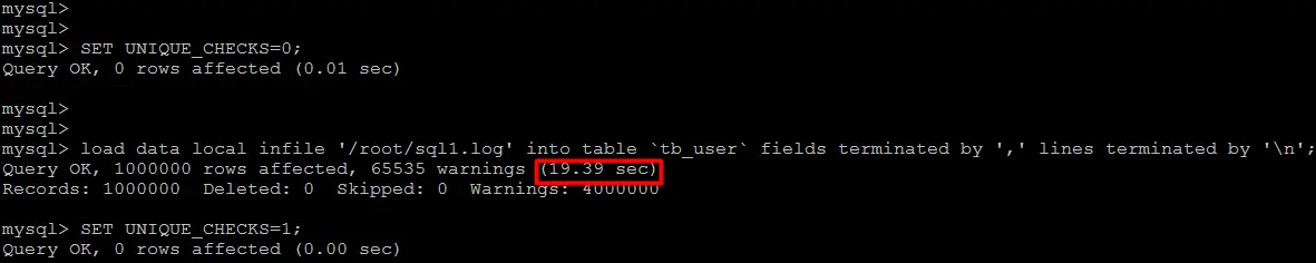 在导入数据前执行 SET UNIQUE_CHECKS=0,关闭唯一性校验,在导入结束后执行SET UNIQUE_CHECKS=1,恢复唯一性校验,可以提高导入的效率。