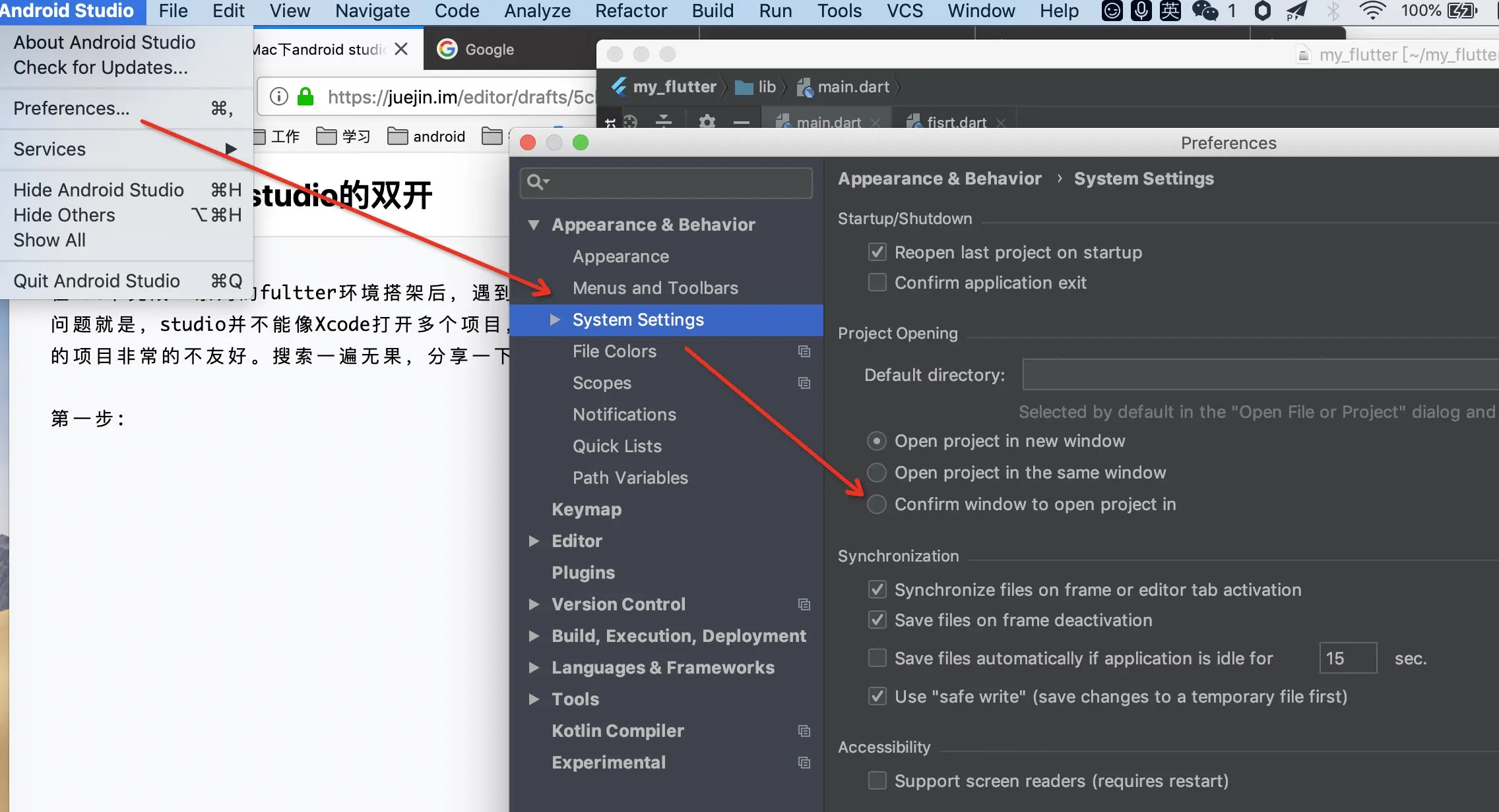 Mac下android studio的双开 大朋鸟儿 2019-04-16 2,950 阅读1分钟 在mac下完成一系列的fultter环境搭架后,遇到了第一个小问题就是,studio并不能像Xcode打开多个项目,对于借鉴别的项目非常的不友好。搜索一遍无果,分享一下。 选中第个一个或者第三个都是可以 再一次打开会弹出一个确认框是后选择第一个就可以了,这样就跟XCode的双开是一样的效果了