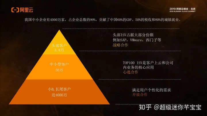 我们今天所做的一切,和整个市场大盘以及SaaS未来的趋势相比,都还算早起孵化。我国中小企业有4000万家,占企业总数的99%,贡献中国60% GDP、50%税收和80%城镇就业。面对这和个巨大的事情,我们和合作伙伴一起把把中国市场分成三大类分别协作: