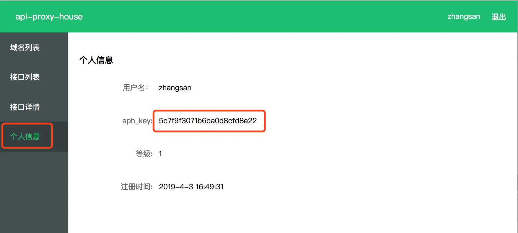 2、进入“个人信息”页,复制aph_key(开发者秘钥)