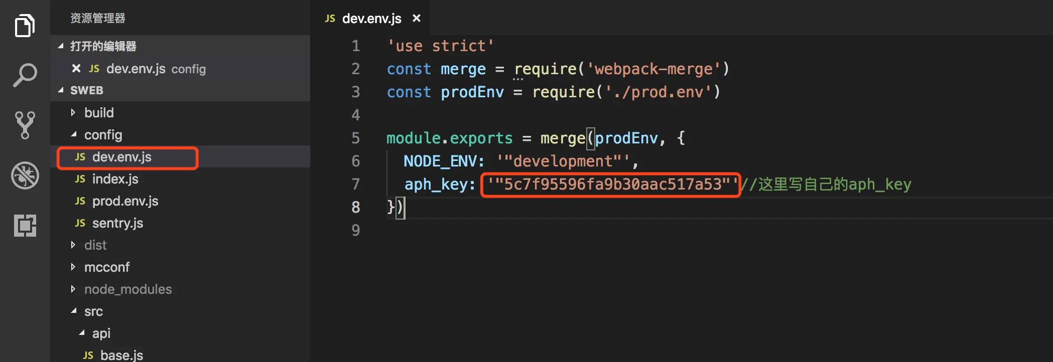 3、在spa项目中,修改 /config/dev.env.js配置文件内的“aph_key”字段,替换为自己的 “aph_key”
