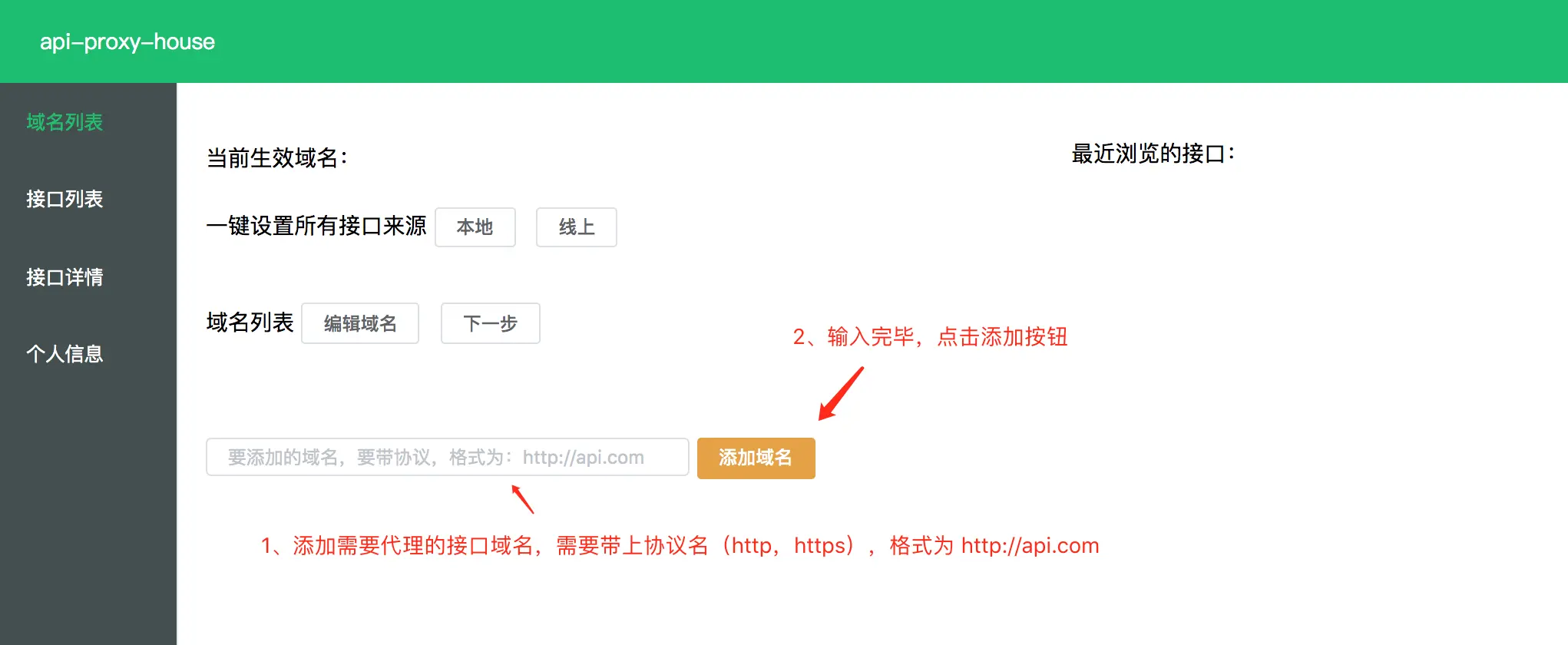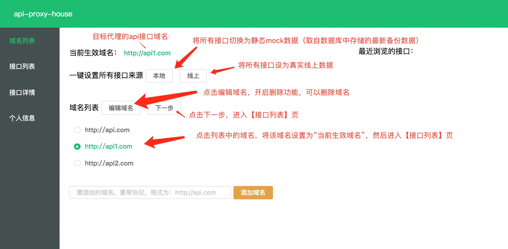 登录成功后,进入“域名列表”页,进行api域名管理,首先新增一个目标代理的api域名,注意,一定要带协议名,输入有效域名