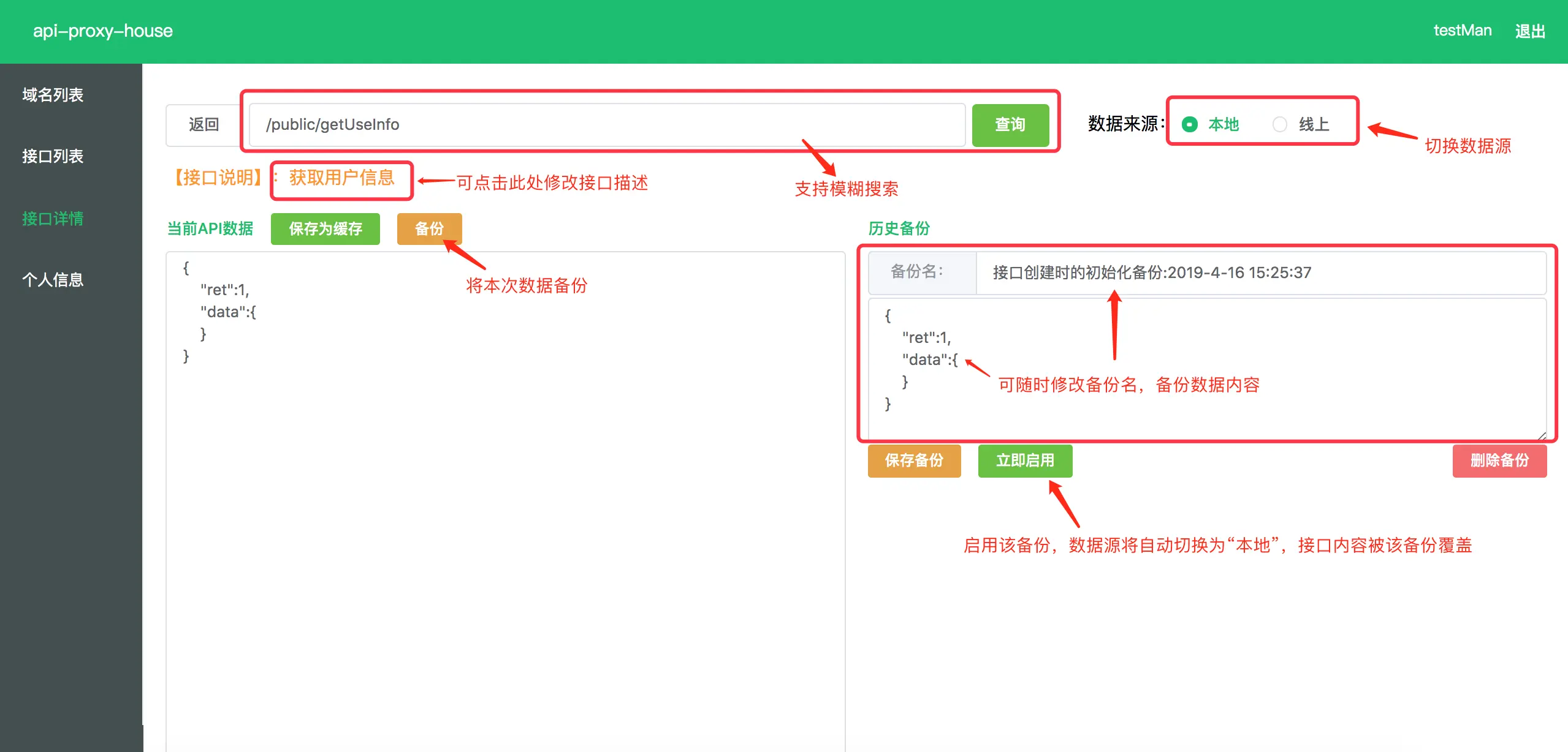 3、测试api不同内容不同交互的场景时,要频繁反复造新的数据内容(如多内容,空内容,报错内容时的交互场景),这时如果能备份接口的多个内容,随时切换,能省很多时间