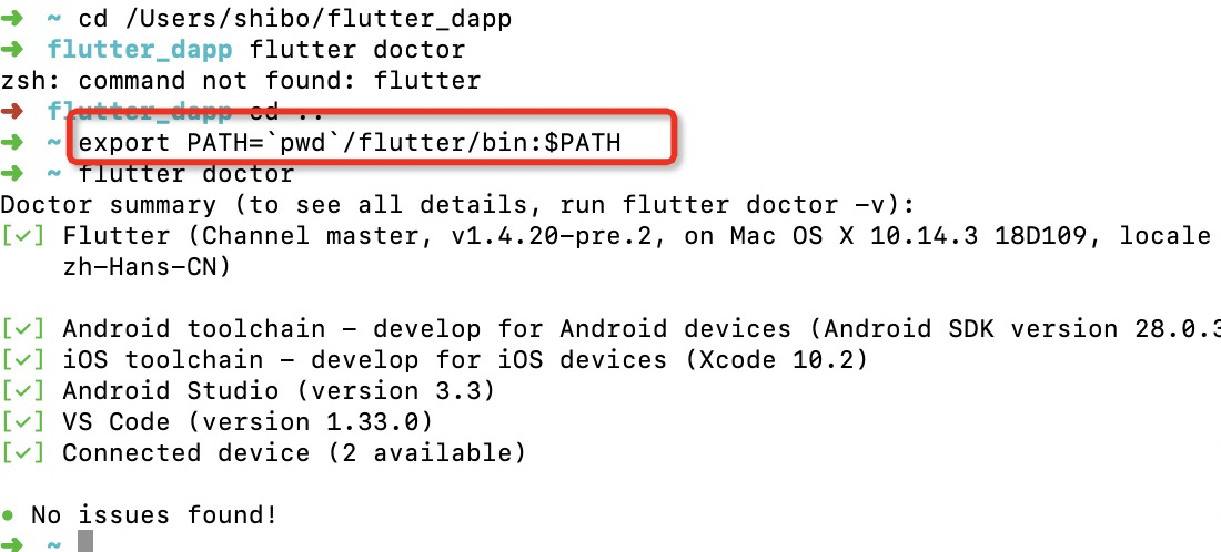 command not found: flutter 大朋鸟儿 2019-04-16 1,022 阅读1分钟 如图所示,在经过一系列的flutter环境的配置之后,现在能正常的运行起来,再次去执行flutter doctor的时候才会发现not found: flutter,无语,头大有没有! 解决办法是 不会进去项目根目录去run,去执行 export PATH=pwd/flutter/bin:$PATH 在试一下flutter doctor -v 结语 完美如初