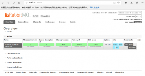 可登陆管理控制台(启用management plugin的情况下),同时可以查看rabbitmq节点的相关信息(进程数,内存使用情况,磁盘使用情况等)