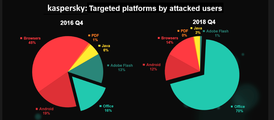 卡巴斯基实验室(Kaspersky Lab)近日警告,在去年第四季受到黑客攻击的平台中,有70%落在微软的Office,原因包括攻击表面众多、与Windows整合,以及从安全的观点来看,微软当初建置Office的许多设计决策是错误的。根据该实验室的追踪,在2016年第四季时,最受黑客青睐的攻击平台为浏览器,占了45%,居次的是Android的19%,微软Office以16%排名第三。但到了2018年的第四季,Office跃升为第一,占所有攻击的70%,浏览器与Android则分占14%与12%。