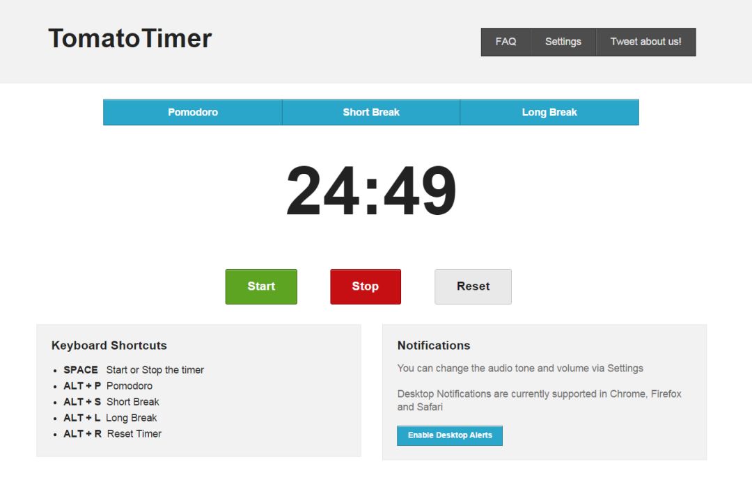 Pomodoro 是一个定时提醒器,它将每个 30 分钟的区间划分成 25 分钟的专注学习时间和 5 分钟的休息时间。使用 Pomodoro 的核心在于,尽最大可能在每个 25 分钟的区间内都保持专注和高效,而不去过多考虑什么时候能完成既定的目标。而在 5 分钟的休息时间里, 你的大脑可以进入 Diffuse Mode 来帮助你理解和概念化所学的内容。