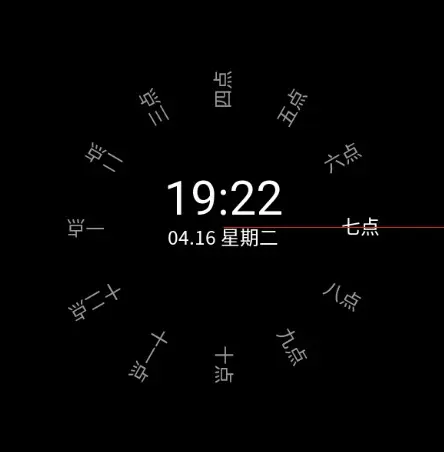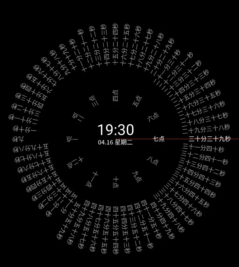 - 「时圈」一圈文字小时,一点、二点..十二点,当前点数为白色,其它为白色+透明度,如图中十点就是白色。