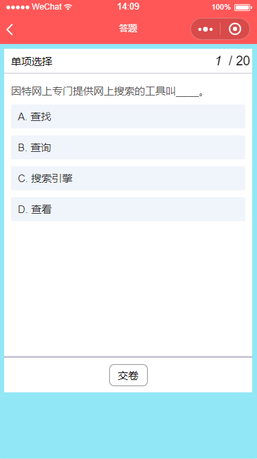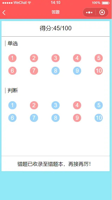 一款功能强大的答题小程序,分为四大功能,答题,学习,排名和错题本,答题功能可以随机从选择的题库中抽取题目作答,学习功能可以浏览全部的题目,并具有记忆功能,下次进入会自动回到学习进度,排名功能可以对每套试卷的作答人员进行分数等排名,错题本会自动记录用户在答题中答错的题目,让用户可以复习,并且可以随时移除题目。 整个小程序非常适合政府、公司和学校进行人员考核、测评等一系列以考促学的活动