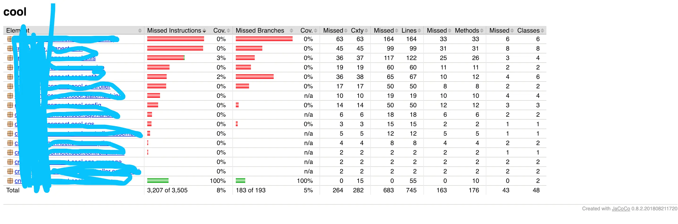 轻松配置完之后愉悦的运行./gradlew jacocoTestReport,完美的在build/jacoco/test/html/index.html看见了测试覆盖率的report