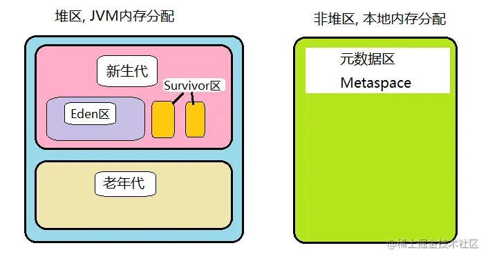 - 而元数据区Metaspace是直接在本地内存(Native Memory)中申请的, 这样元数据区的大小(方法区大小)只会受本地内存大小限制, 和虚拟机进程所分得内存无关.