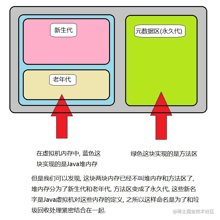 - 而HotSpot虚拟机的内存结构由三大部分组成: 新生代, 老年代和元数据区(JDK1.7及以前叫老年代). 其中新生代和老年代是虚拟机规范中Java堆内存的实现, 元数据区是规范中方法区的实现. 在讲述为什么这么定义之前, 先明确这个关系对于理解概念是很重要的, 下面有幅图帮助理解.