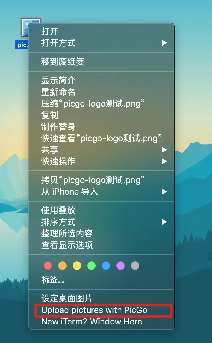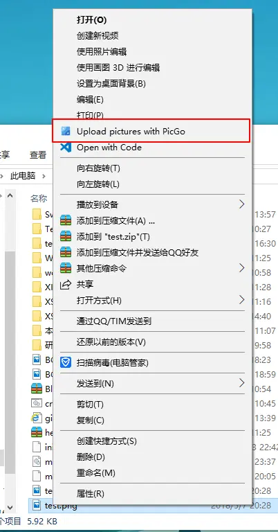这样用户在安装PicGo之后,打开软件之后,他的右键菜单就多了一个「Upload pictures with PicGo」项了。