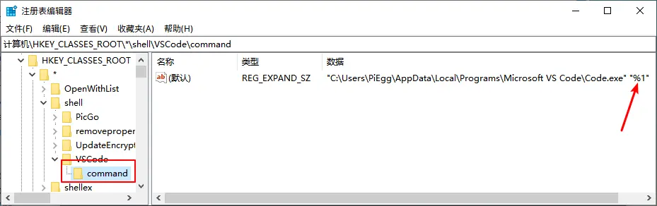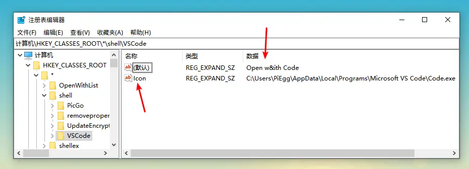 可以看到一个「默认」的属性下的数据为「Open w&ith Code」,这个就是我们看到的菜单名。而一个叫「Icon」的属性下的数据为VSCode的exe安装路径。所以可以认为这个Icon可以获取exe的Icon并显示到菜单上。