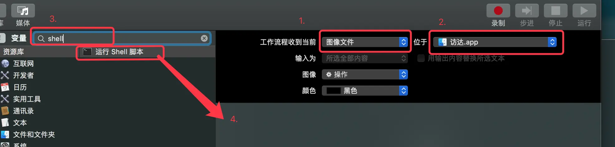 将快速操作的工作流程限制到图像文件,并且只作用于访达.app里,同时在左侧菜单里找到shell组件,将其拖拽到右侧编辑区: