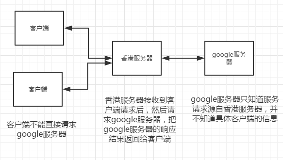 目前国内无法访问google,但是我们有时说挂个代理,然后就能顺利访问,而这种代理模式就是正向代理。假如我们在香港有一台服务器,这台服务器是能访问google的,而国内无法直接访问谷歌,但是可以访问香港的服务器。每次我们请求香港服务器,香港服务器拿到我们请求以后,再去访问google服务器,google服务器把响应返回给香港服务器,香港服务器再把响应返回给我们。这样我们就能顺利的访问google了。