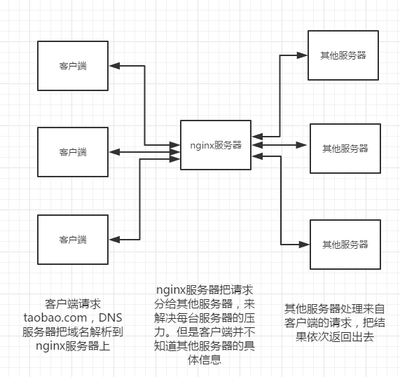 客户端请求taobao.com,DNS服务器把域名解析到nginx服务器上(简单的这么理解),nginx服务器接收到之后,按照一定的规则分发给了后端的业务处理服务器进行处理了。