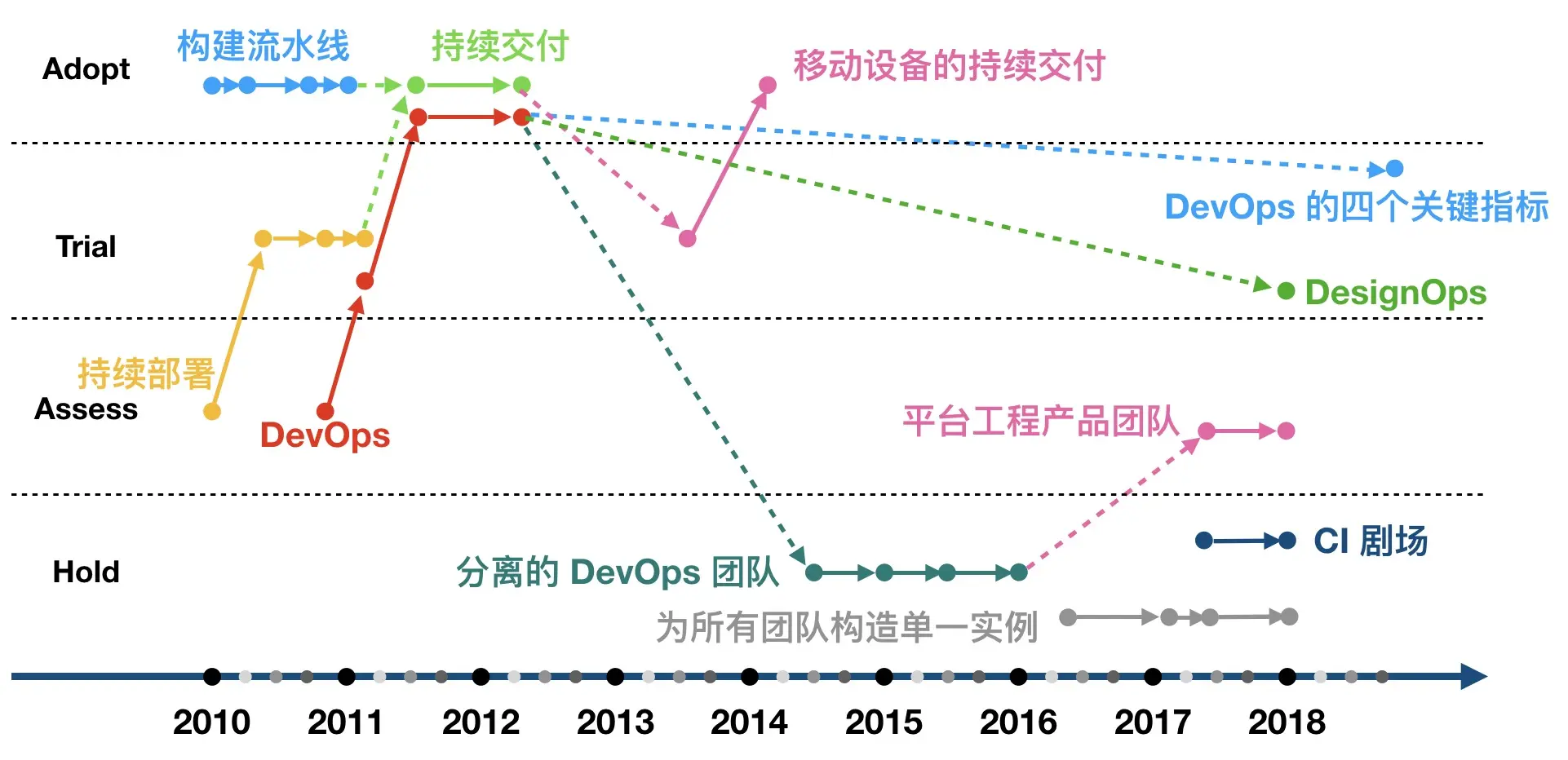 虽然持续集成、构建流水线和持续部署从技术雷达创刊号就存在。但DevOps作为一个正式条目进入技术雷达的评估象限是在2010年8月的第三期技术雷达。那时,对DevOps的描述是这样的: