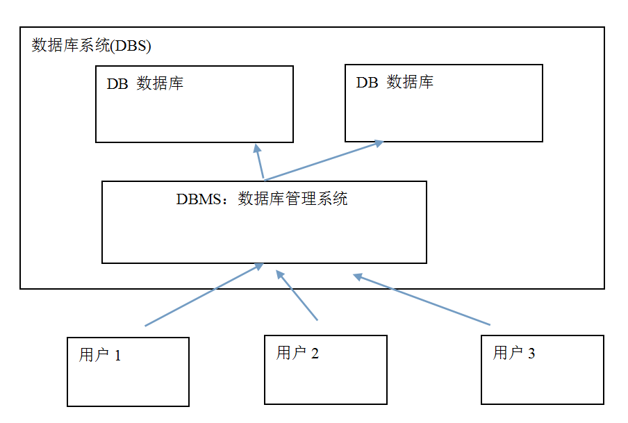 - 数据库管理系统(DataBase Management System,DBMS):指一种操作和管理数据库的大型软件,用于建立、使用和维护数据库,对数据库进行统一管理和控制,以保证数据库的安全性和完整性。用户通过数据库管理系统访问数据库中的数据。