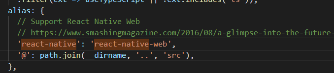 我们打开项目根目录下的 /config/webpack.config.dev.js 文件,找到 'react-native': 'react-native-web', 这一行,在下面加入: