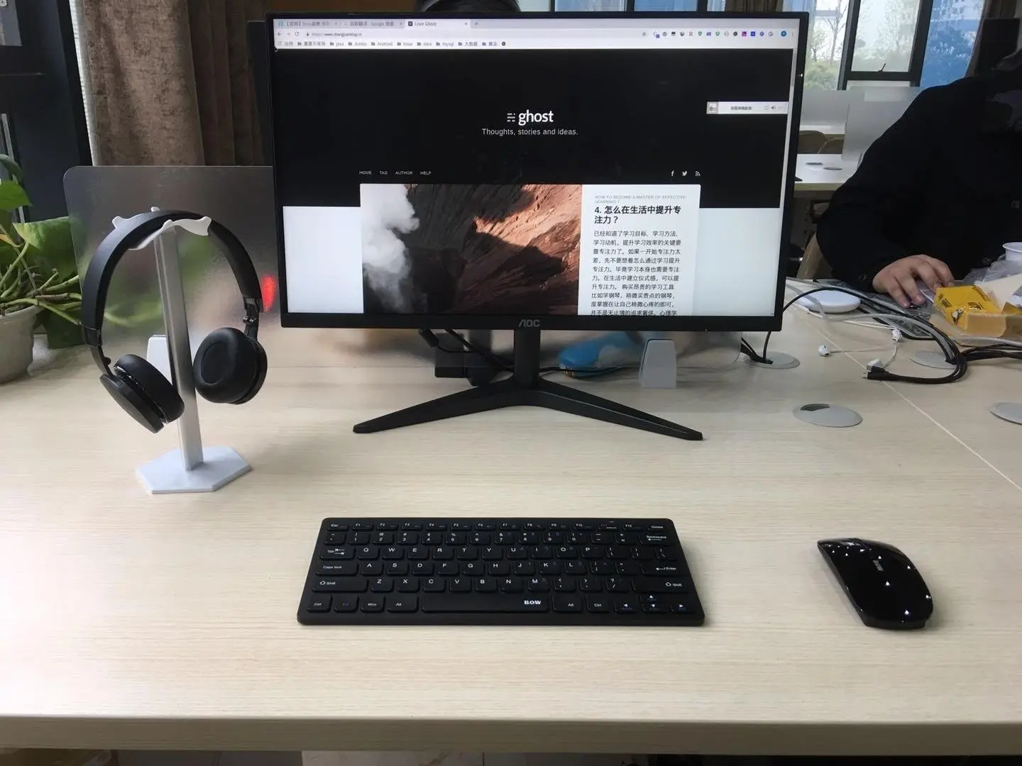 什么意思呢?比如说,办公桌面保持简洁,像我的办公桌面一般就一套无线鼠键差不多了,其他杂七杂八的都放在柜子里。下图是我的办公桌面