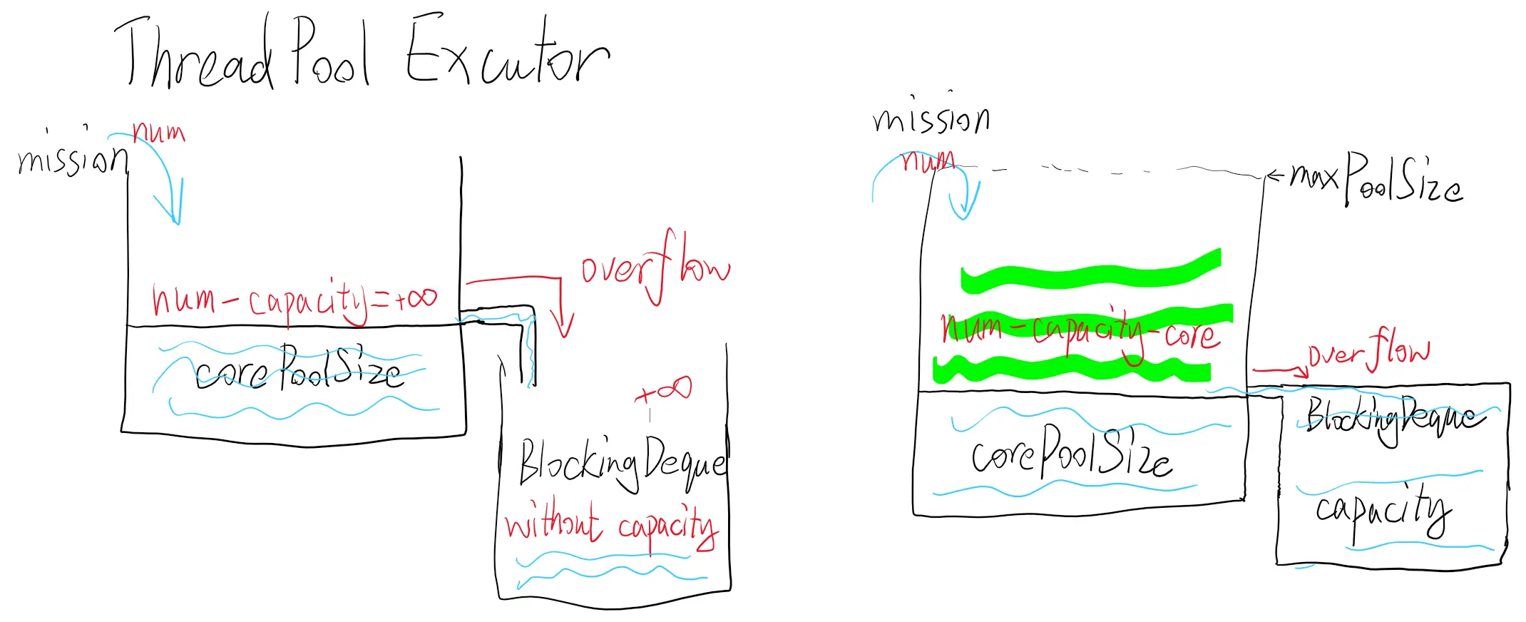 等待队列可视为右方的蓄水箱,不设定大小则相当于无限积水,左侧水箱maxSize永远不会满; 但是如果等待队列有容量,左侧水箱自然也就会出现溢出到maxSize的情况(即num-capacity-corePoolSize需≤maximumPoolSize)