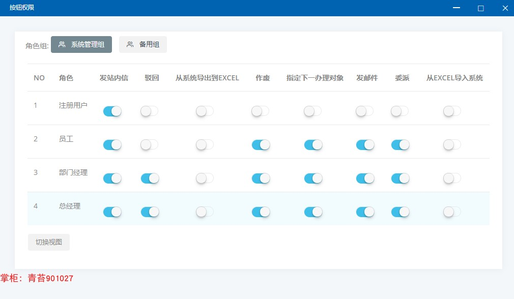 . 权限管理:点开二级菜单进入三级菜单显示 角色(基础权限)和按钮权限角色(基础权限): 分角色组和角色,独立分配菜单权限和增删改查权限