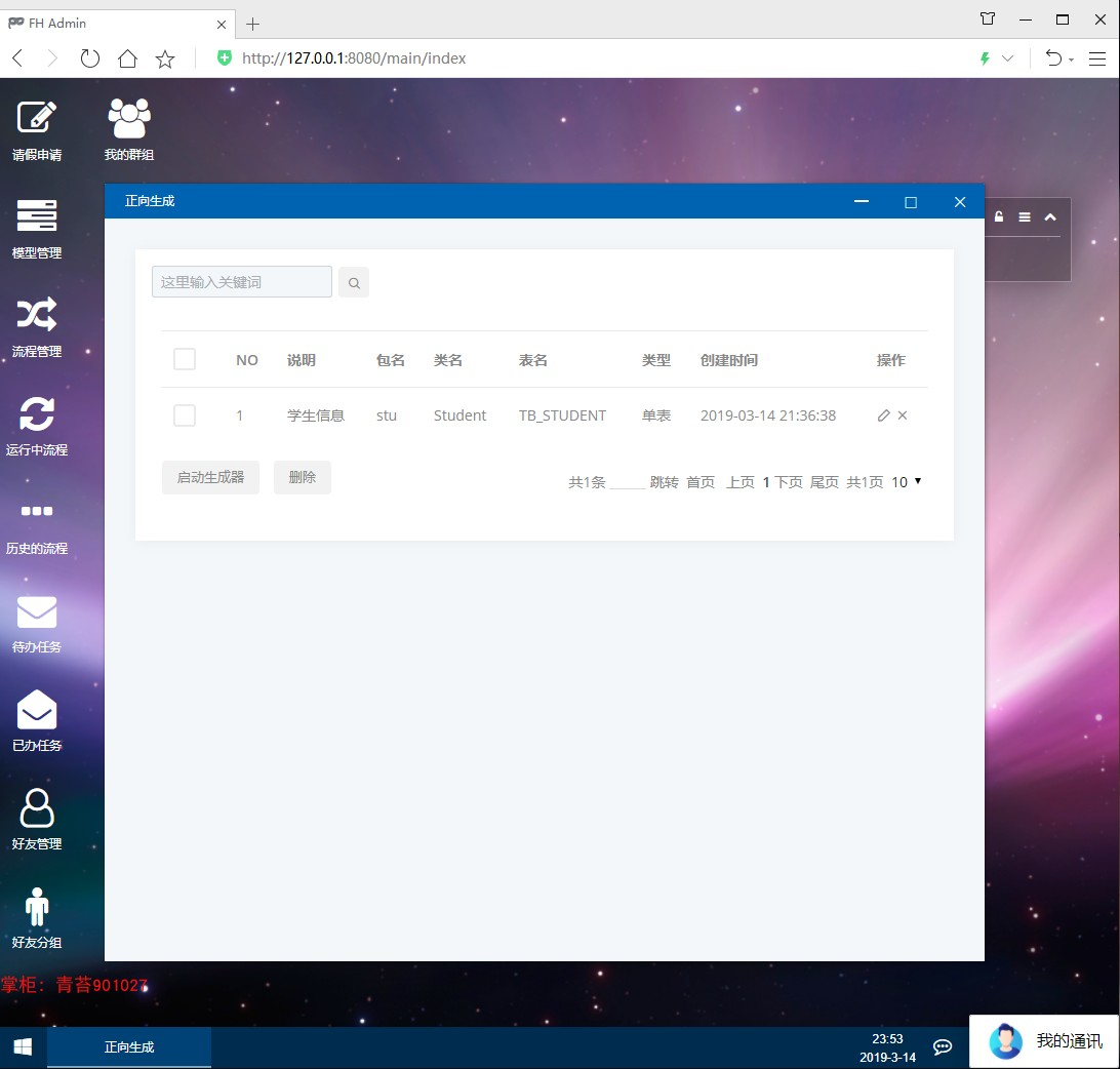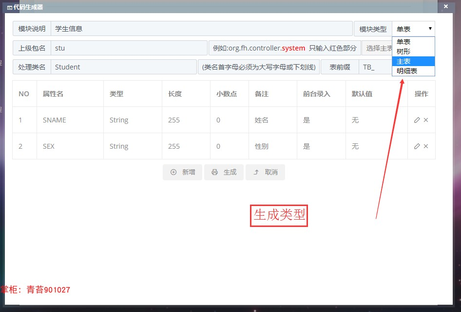 :生成完整的模块代码,并保留生成记录模版,可复用 正向生成: 生成完整的模块,页面、处理类、mapper层、service层、myabaits的xml 建表的sql脚本等