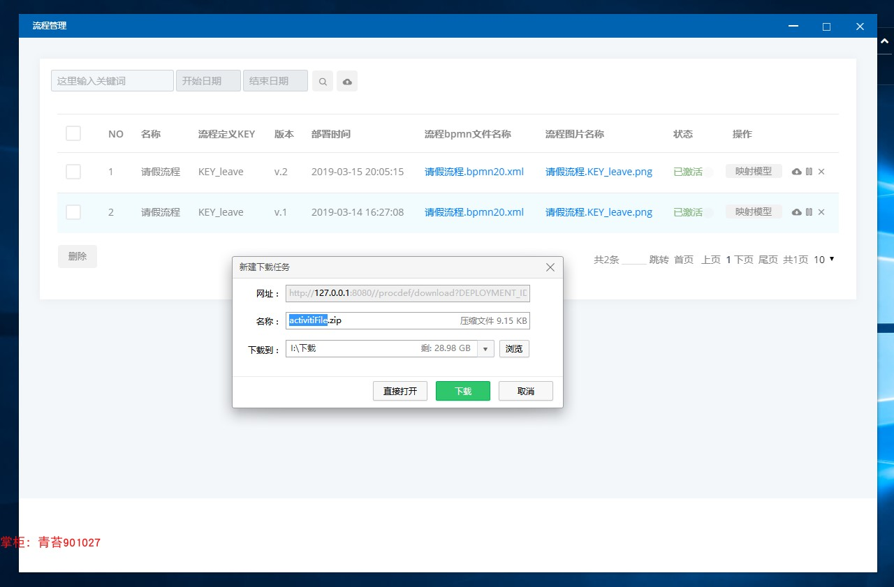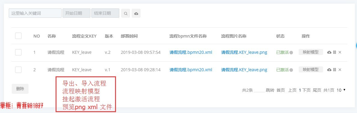 2.流程管理 :导入导出流程资源文件、查看流程图、根据流程实例反射出流程模型、激活挂起