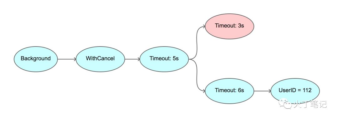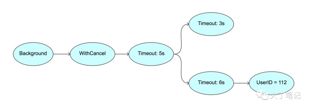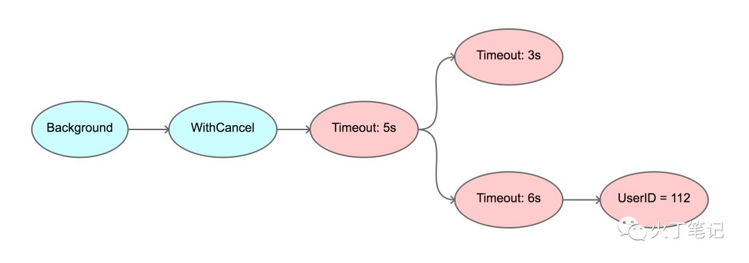 1type userID string 2 3func tree() { 4 ctx1 := context.Background() 5 ctx2, _ := context.WithCancel(ctx1) 6 ctx3, _ := context.WithTimeout(ctx2, time.Second*5) 7 ctx4, _ := context.WithTimeout(ctx3, time.Second*3) 8 ctx5, _ := context.WithTimeout(ctx3, time.Second*6) 9 ctx6 := context.WithValue(ctx5, userID("UserID"), 123)1011 // ...12}