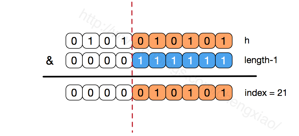 我们看到,上面的&运算,高位是不会对结果产生影响的(hash函数采用各种位运算可能也是为了使得低位更加散列),我们只关注低位bit,如果低位全部为1,那么对于h低位部分来说,任何一位的变化都会对结果产生影响,也就是说,要得到index=21这个存储位置,h的低位只有这一种组合。这也是数组长度设计为必须为2的次幂的原因。