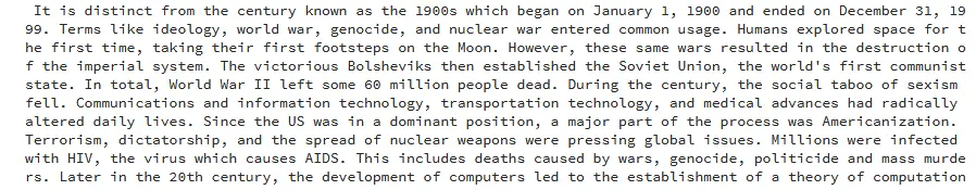 As you can see, running the code summarizes the lengthy Wikipedia article and gives a simplistic overview of the main happenings in the 20th century.
