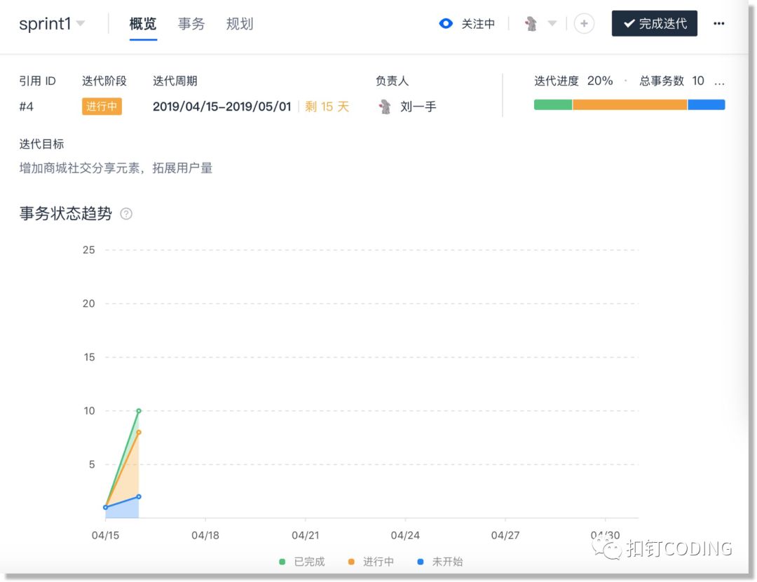 各成员按照优先级处理自己负责的事务,每日通过 15 分钟左右的站立会议,沟通迭代进度和期间发生的问题,迅速同步信息。团队所有成员可在迭代概览中跟踪迭代进度、事务处理趋势和速度。