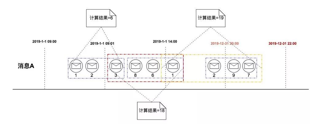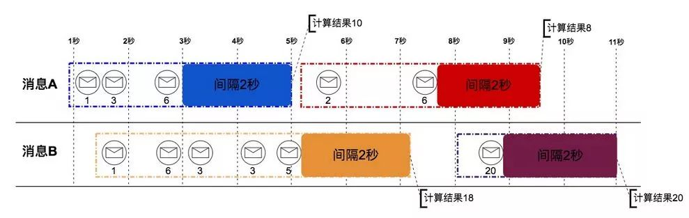 例子:每只股票超过2秒没有交易事件时计算窗口内交易总金额。下图中“消息A、消息B”代表两只不同的股票。