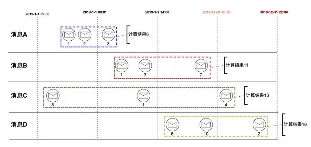 例子:以用户分组,当每位用户有3次付款事件时计算一次该用户付款总金额。下图中“消息A、B、C、D”代表4位不同用户,我们以A、B、C、D分组并计算金额。