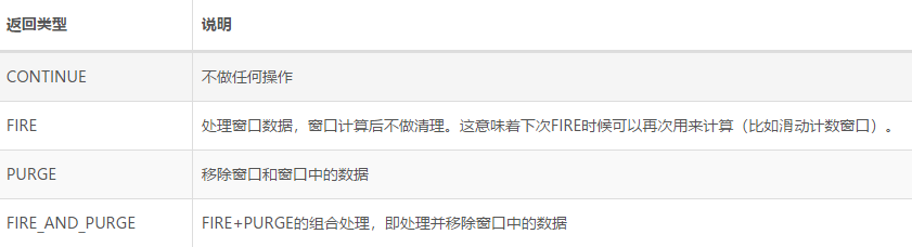 当有数据流入Window Operator时会触发onElement方法、当处理时间和事件时间生效时会触发onProcessingTime和onEventTime方法。每个触发动作的返回结果用TriggerResult定义。