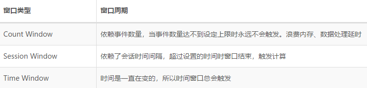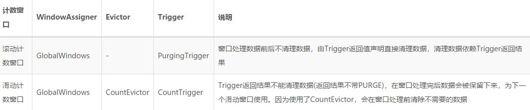 Flink的内置窗口(Counter、Session、Time)有自己的触发器实现。下表为不同窗口使用的触发器。