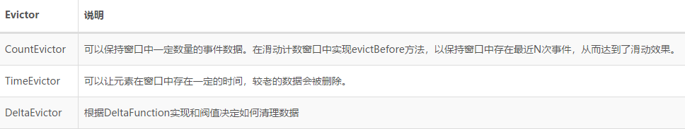 Evictor驱逐者,如果定义了Evictor当执行窗口处理前会删除窗口内指定数据再交给窗口处理,或等窗口执行处理后再删除窗口中指定数据。