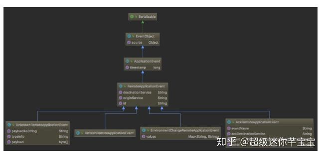 Bus 中定义了远程事件 RemoteApplicationEvent,该事件继承了 Spring 的事件 ApplicationEvent,而且它目前有 4 个具体的实现: