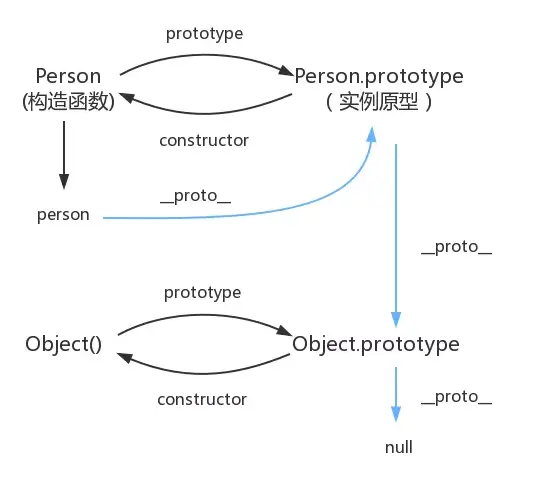 Person是构造函数, Person.prototype 是原型对象, person是实例, 实例可以通过_proto_找到原型对象。