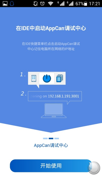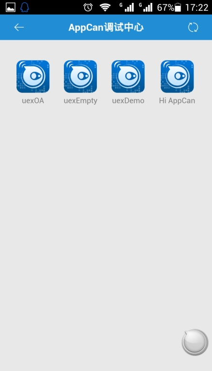 目录:(AppCanStudioEnterpriseV3.3\AppCan-IDE\plugins\com.appcan.ide.eclipse.hdt.player_1.0.0.201503161536\AppCanPlayer) 在appcan开发者平台新建一个专门用来调试的项目,讲调试app的源码拷贝出来,替换新建项目的代码,配置好app的插件引擎进行打包。 打包好了之后安装app,启动app后出现以下页面即算app打包成功。
