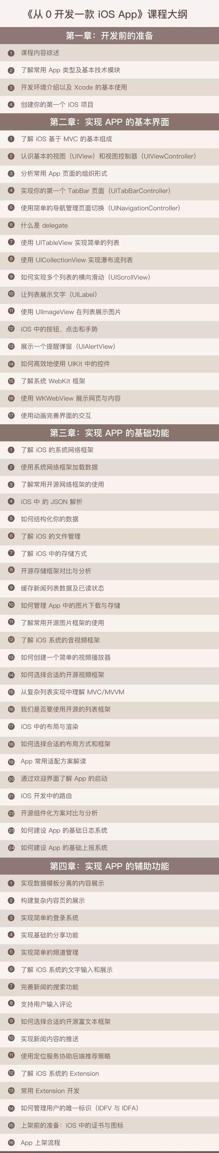 最后,对一些常用的功能进行补充,包括Extension的开发、分享、登录、推送、iOS上架等等,这些模块相对比较独立,但是可以让你对整个App的功能、包括移动开发相关的一些生态有全面的了解。